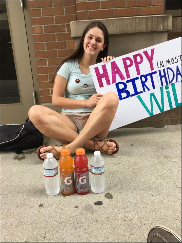My sister with our "Happy (almost) Birthday Will" sign. The workers brought us drinks and Will's drum tech, Sean Buttery, took a pic of us and sent to Will.